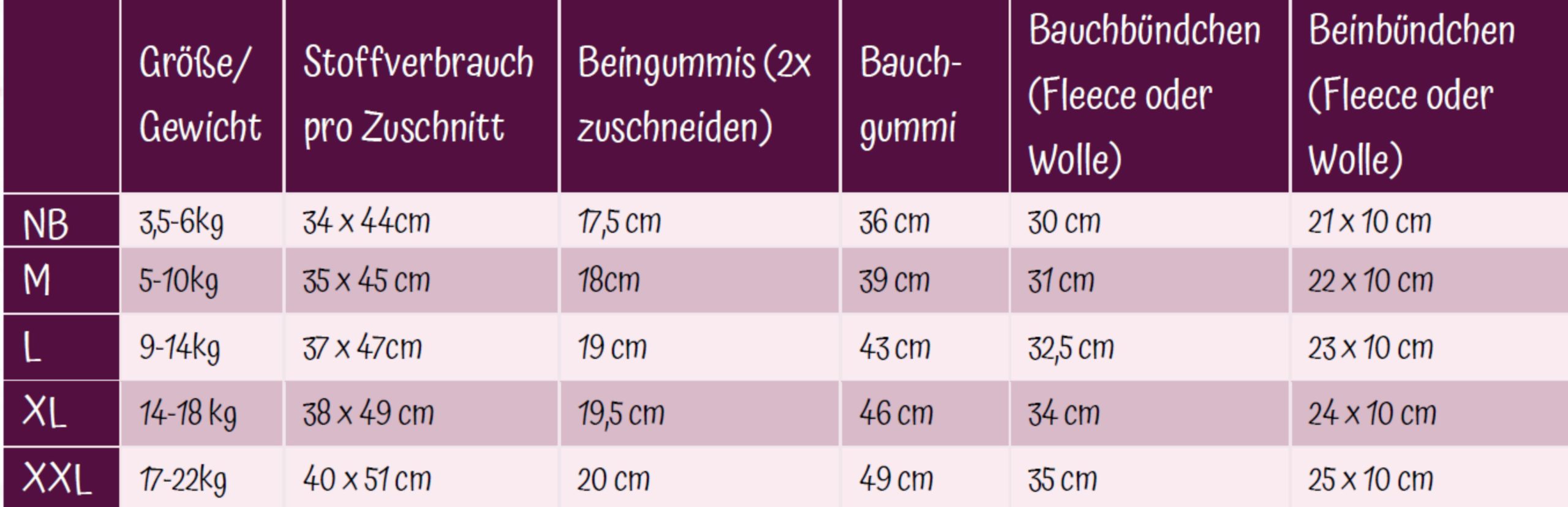 Das Schnittmuster kommt als Mehrgrößenschnitt in 5 Größen und deckt etwa 4-20kg ab, im Probenähen haben wir die größte Größe erfolgreich bis 22kg getestet.