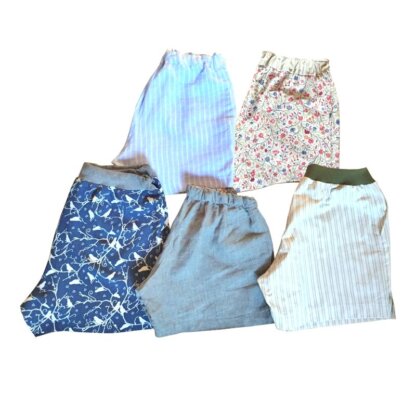 Die Frau fluffster Shorty ist ein bequem sitzender Schnitt in Größe 34-52. Sie wird in ihrer Version als gemütliche Schlafhose aus leichter Webware (Viskosestoffe, Satin, dünne Leinenstoffe, Hemdenstoffe…) genäht. Wer es extra gemütlich mag, kann die Shorty auch aus Jersey nähen. Und wenn ihr etwas robustere Stoffe wie Canvas oder Denim verwendet, gibt sie sogar eine ganz passable kurze Hose für “oben drüber” ab. Je nach Verwendungsart könnt ihr die Boxershorts mit oder ohne Eingrifftaschen nähen. Im ausführlichen Ebook findet ihr neben der Nähanleitung für eure Shorty auch ein Kapitel zur Schnittmusteranpassung, sodass ihr Frau fluffster direkt an eure Proportionen und Bedürfnisse anpassen könnt. Für noch mehr Individualisierungsmöglichkeiten stelle ich verschieden Bündchenlösungen vor (Formbund, Bund aus Bündchenware oder Dekogummi). Und zur Verbesserung euers Näh-Know-Hows (sowie zur Optimierung der Gemütlichkeit eurer Hose) zeige ich euch detailliert, wie ihr eine Shorty mit Kappnähten näht.