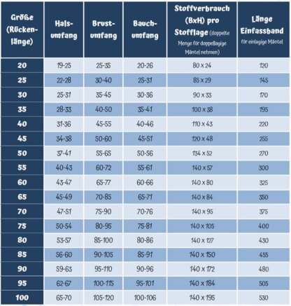 Aber nun zum Schnittmuster: Der gassifluff Hundemantel kommt in gleich 17 GrĂśĂen daher und passt ab RĂźckenlänge 20 (Minichihuaha) und bis zu RĂźckenlänge 100 (das ist super groĂ, die Deutsche Standarddogge hat ca. 85 cm RĂźckenlänge). So passt der Mantel auch Wolfhounds und Deerhounds. Und fĂźr die lieben “Scotties” ist auch eine beamerfreundliche Mehrebenendatei mit dabei.