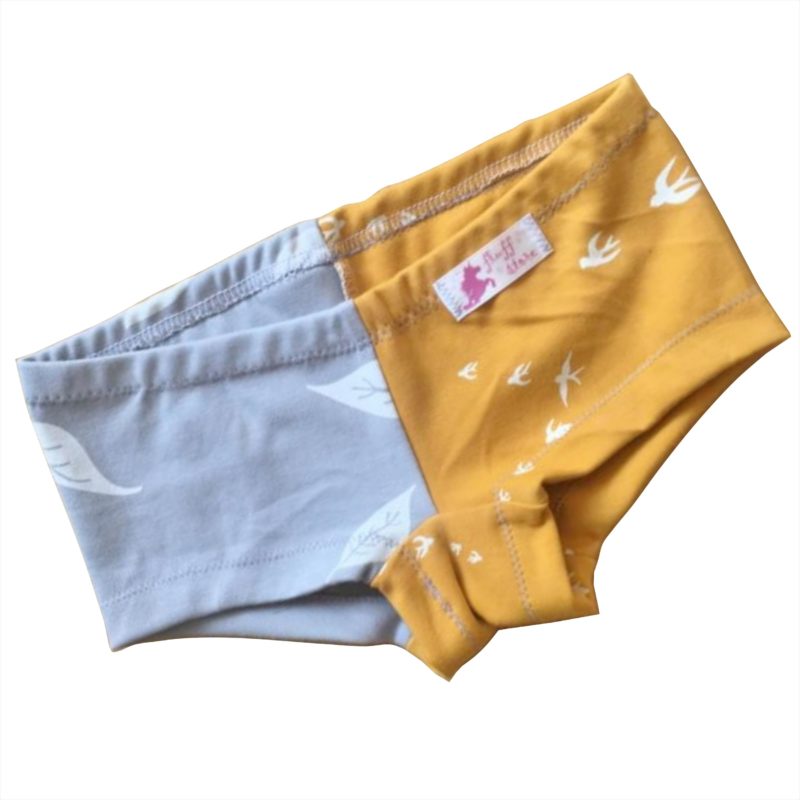 Miss fluffel ist eine sogenannte Boy-shorts, also eine Unterhose mit etwas längerem Bein für Mädchen. Sie kommt in den Doppelgrößen 74/80-170/176 und deckt so den gesamten Zeitraum zwischen Windeln und Erwachsenenalter ab. Der Schnitt sitzt bequem und bedeckt alles, was bedeckt werden soll. So blitzt auch nichts raus, wenn Mädel mal mit hochgerutschtem Rock kopfüber vom Klettergerüst hängt. Es gibt wie beim Bruder Mister fluffel diverse Teilungslinien und Variationsmöglichkeiten, die im eBook ausführlich vorgestellt werden. Miss fluffel ist perfekt, um kleine Jerseyreste zu verwerten und auch ein tolles Upcycling Projekt!
