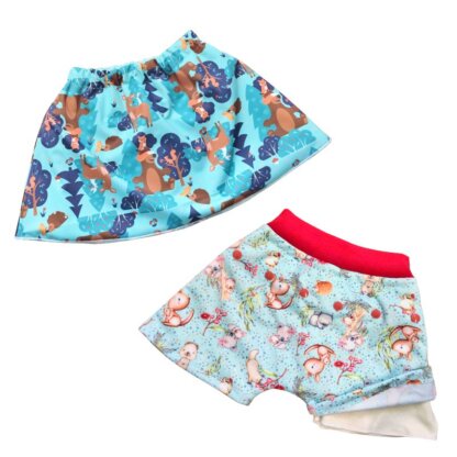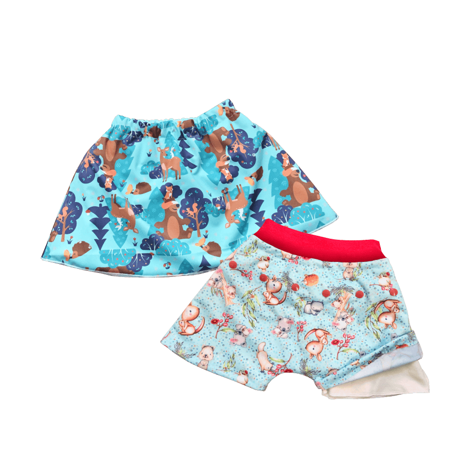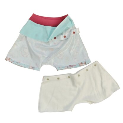 Nanu, was gibt es denn da Neues aus dem fluff store? Den schlafluffrock – den allerersten, super praktischen und vielseitig einsetzbaren Windelrock zum selber nähen. Der Nässeschutzrock besteht aus einer wasserabweisenden Außenschicht und einem saugfähigen Innenleben. Ihr könnt ihn für euer windelfreies Baby verwenden, wenn ihr keine Lust auf Windeln habt und trotzdem sicherstellen wollt, dass die Unterlage trocken bleibt. Oder er begleitet euer großes Kind beim Trocken werden, wenn es keine Windel mehr braucht, ab und zu (z. B. im Schlaf) doch noch mal ein Unfall passiert. schlafluffrock ist eine perfekte Ergänzung rund um das Thema Stoffwindeln, windelfrei und trocken werden. Er bietet maximale Bewegungsfreiheit und Gemütlichkeit für alle Lebenslagen und schützt Bett, Couch und sonstige Unterlagen zuverlässig vor Nässe. Für die nässeabweisende Außenlage könnt ihr euch zwischen Woll- und PUL Stoff entscheiden. schlafluffrock kann mit fest eingenähtem Saugmaterial (nur für die Variante aus PUL) oder aber auch mit einknöpfbarer Saugeinlage (PUL oder Wolle) gestaltet werden. Dadurch, dass die beiden Röcke auch in der AiO Variante nur oben miteinander verbunden sind, wird eine gute Durchspülung und damit hygienische Reinigung sowie eine schnelle Trocknung des Saugmaterials gewährleistet. Dank eines variabel verstellbaren Bundes wächst schlafluffrock lange mit, sodass nur 4 Größen notwendig sind, um alle Kinder von Mini-Neugeborenem (Kleidergröße 56) bis hin zum Großkind (ca. 12 Jahre, Kleidergröße 158) abzudecken. Vier Snaps in der Mitte an Außen- und Innenrock können nach Belieben geschlossen werden, um ein Hochrutschen des Nässeschutzes zu verhindern. Der Nässeschutzrock sieht euch für euren Jungen zu mädchenhaft aus? Gar kein Problem, der Schnitt hält eine Variation bereit, die den Nässeschutzrock zur Hose macht.